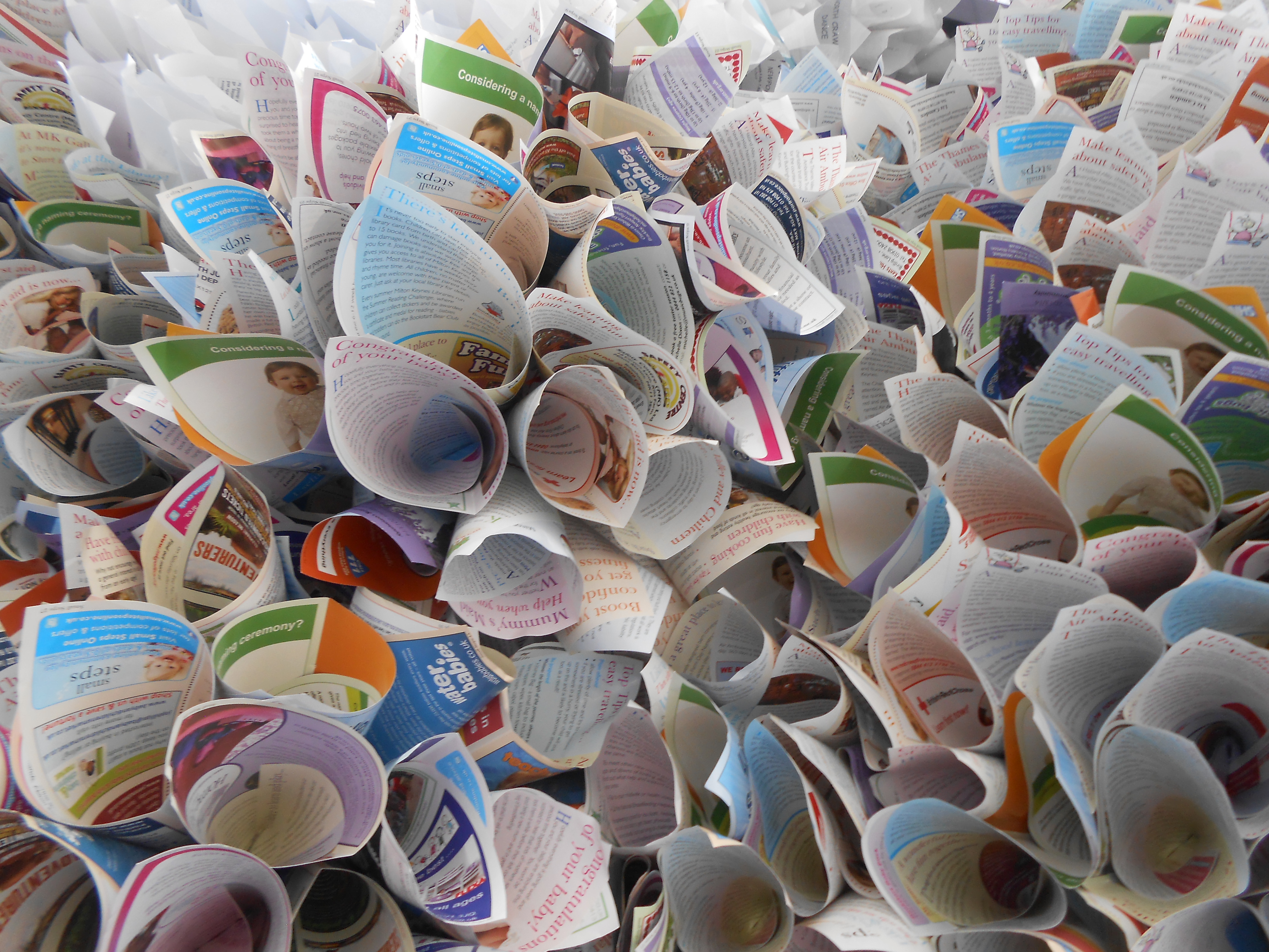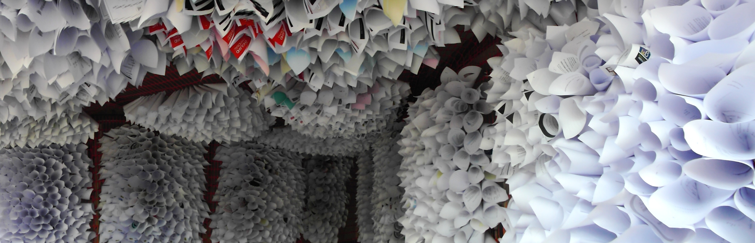 The visual feast has been created using discarded, donated paper - from companies, organisations and individuals in the area: From office memos with cryptic messages to beautifully handwritten notes.