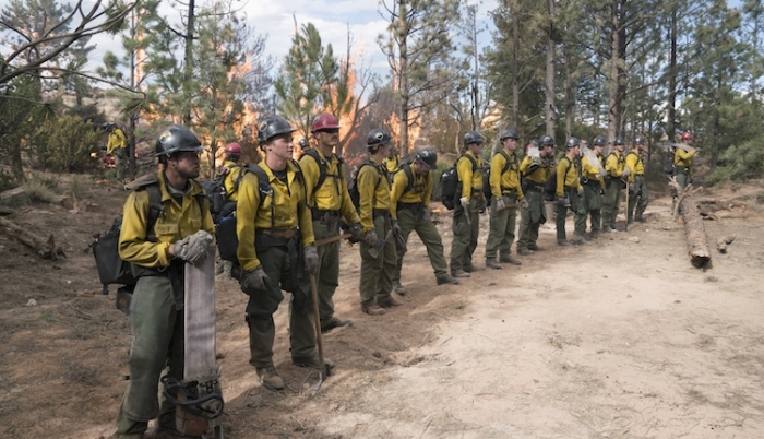 In this film based on real-life people, places and pyres, the manly male fire fighters who will save the day (led by a gruffly impressive Josh Brolin) are visually distanced from their needy wives and children in isolated locations.