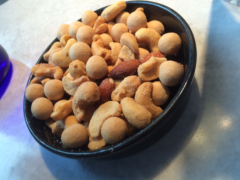 A portion of Noci is shared. On the menu to whet our appetite, its yummy blend of salty, smoky almonds, cashews and coated, very crunchy chick peas is devoured with ease.