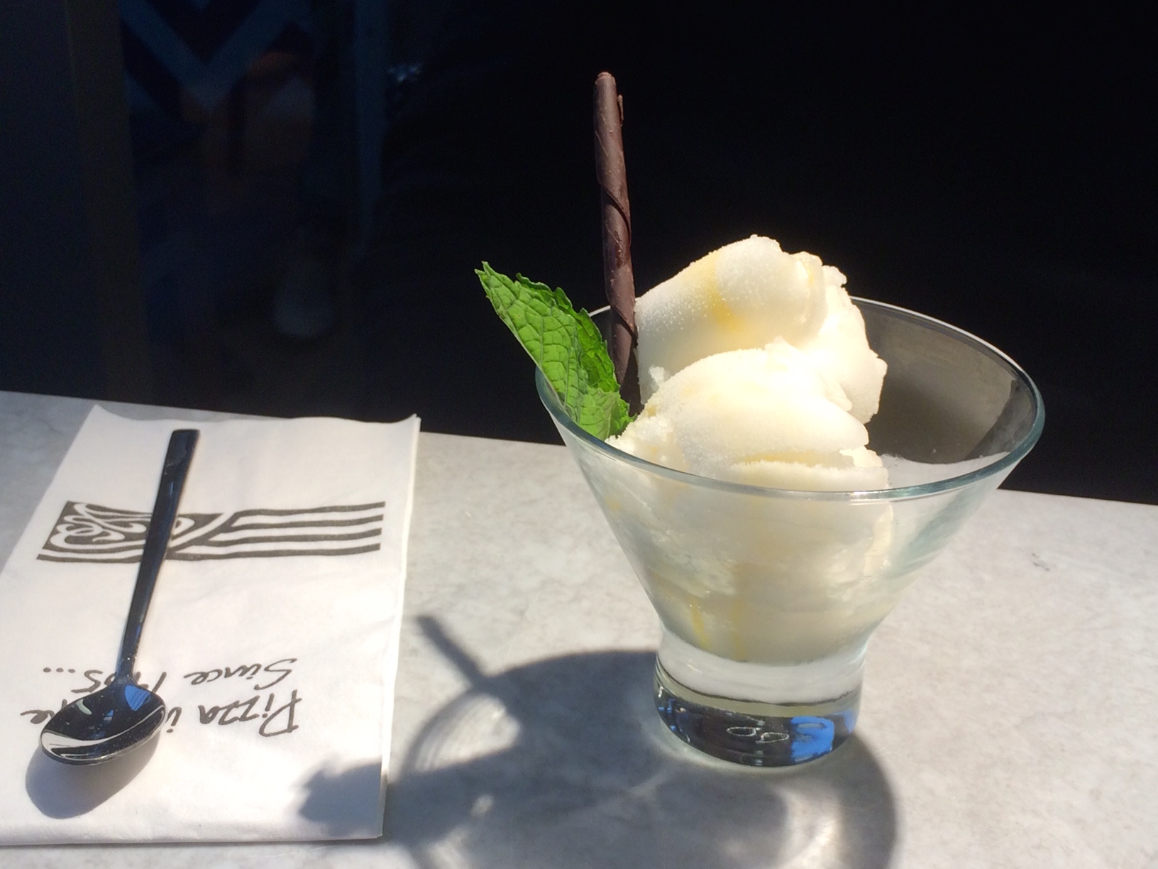 He is digging into a one scoop lemon curd sorbet served with a chocolate straw and fresh mint.