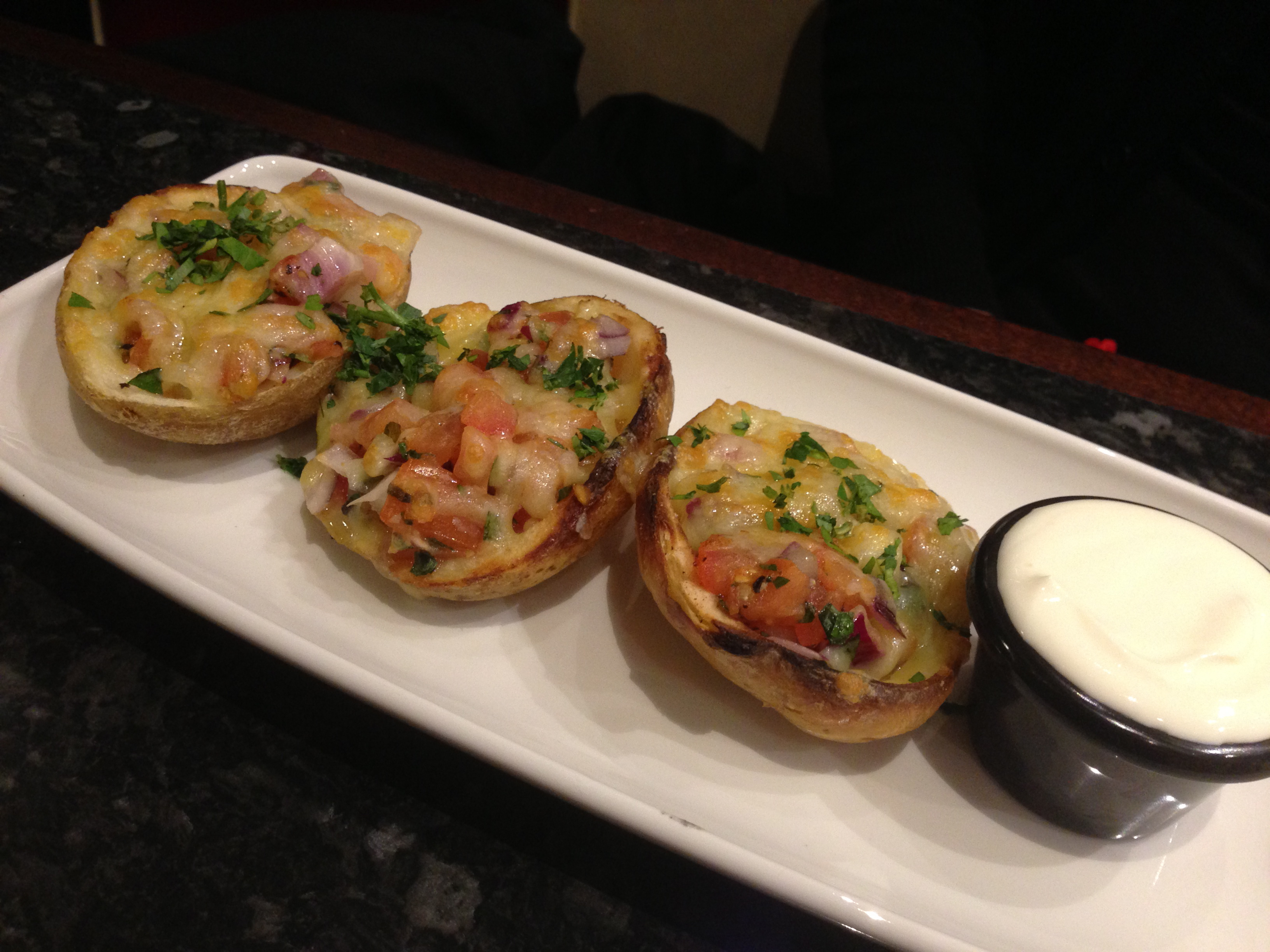 We nibble on wafer thin, triumphantly tasty garlic pizza bread while waiting for our starters proper - a portion of garlic cheese mushrooms and a trio of potato skins loaded with melted cheddar and homemade bruschetta mix.
