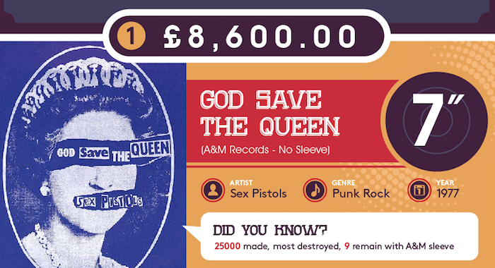 God Save the Queen – The infamous Sex Pistols record that sold for only 6 days under the A&M pressing, before scandal caused them to part ways with the company. Even a copy of the original without the sleeve sells for £8600.