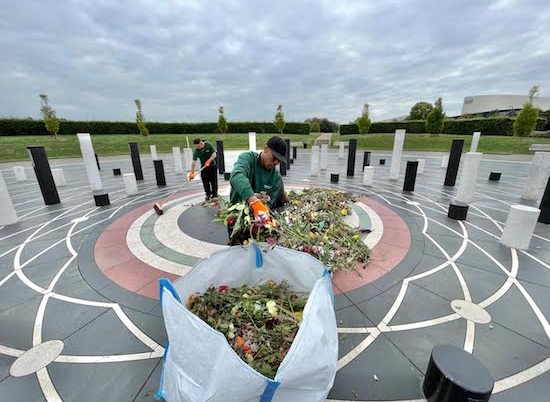 Just days into their new jobs, recruits to the newly-formed Parks Trust Cleansing Team have undertaken what could be their most momentous task – removing the thousands of flowers placed at The Milton Keynes Rose in honour of Her late Majesty, Queen Elizabeth II.