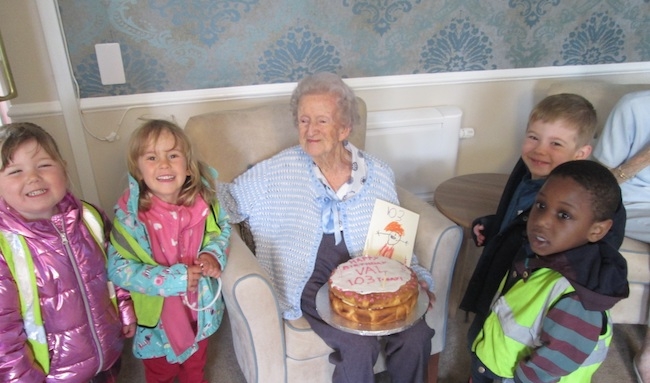 Children from Acorn at Kents Hill joined Val to celebrate her 103rd birthday, and they delivered a yummy birthday cake and a beautiful card.