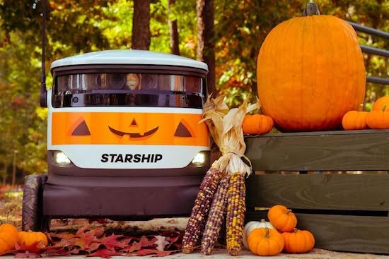 The ‘PumpkinBots’ from Starship Technologies are making deliveries via the Starship Food Delivery app, which is available on iOS and Android.