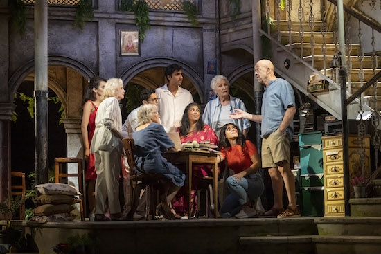 Colin Richmond’s striking, static, set spans the width and depth of the stage to simultaneously present inside and outside spaces at the run-down colonial home turned hotel. Inside, passageways and staircases surround a central reception area. Outside, lush green plants and delicate fairy lights create an oasis of old-world Indian charm in a courtyard garden. The attention to detail is impressive and immersive, right down to the hum of traffic and echoing call to prayer audible in the distance.